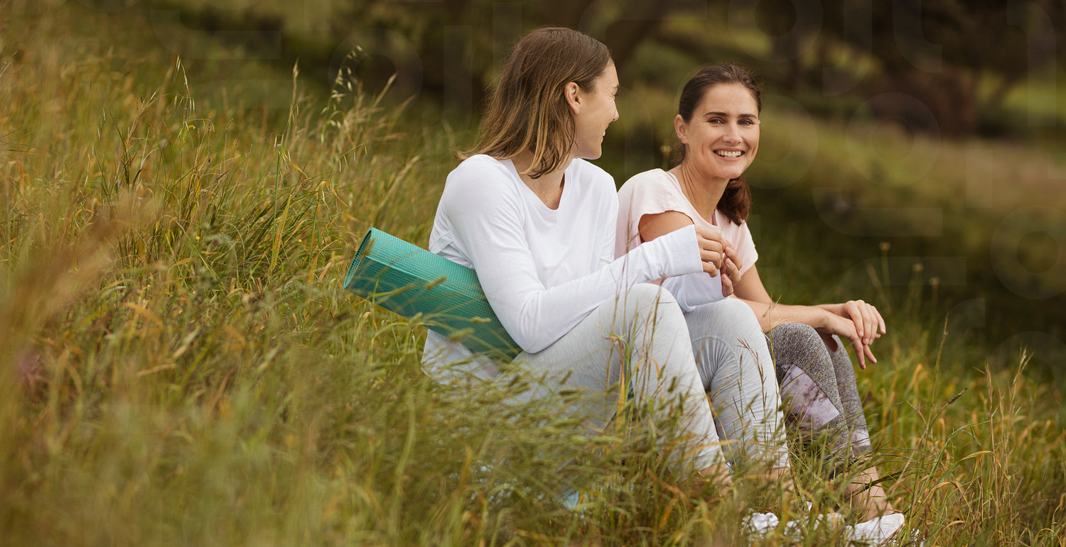 Women friends relaxing in a park after a workout. Fitness women sitting together in the meadows and talking.