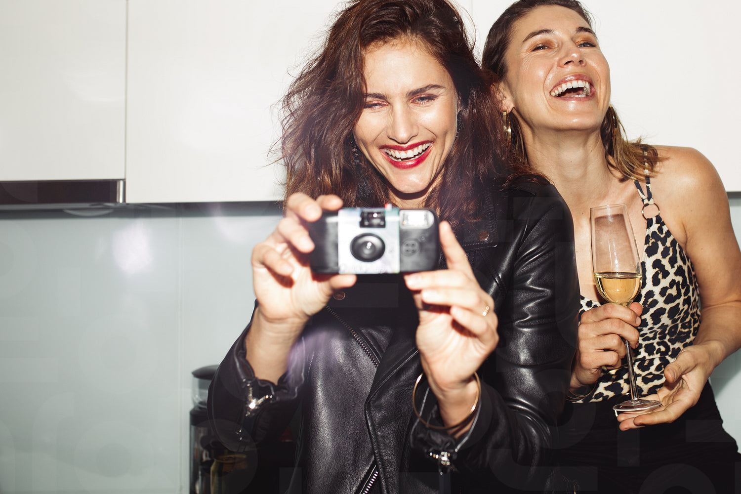 Cheerful women partying at home drinking wine. Woman taking a photo on a disposable camera at a house party.
