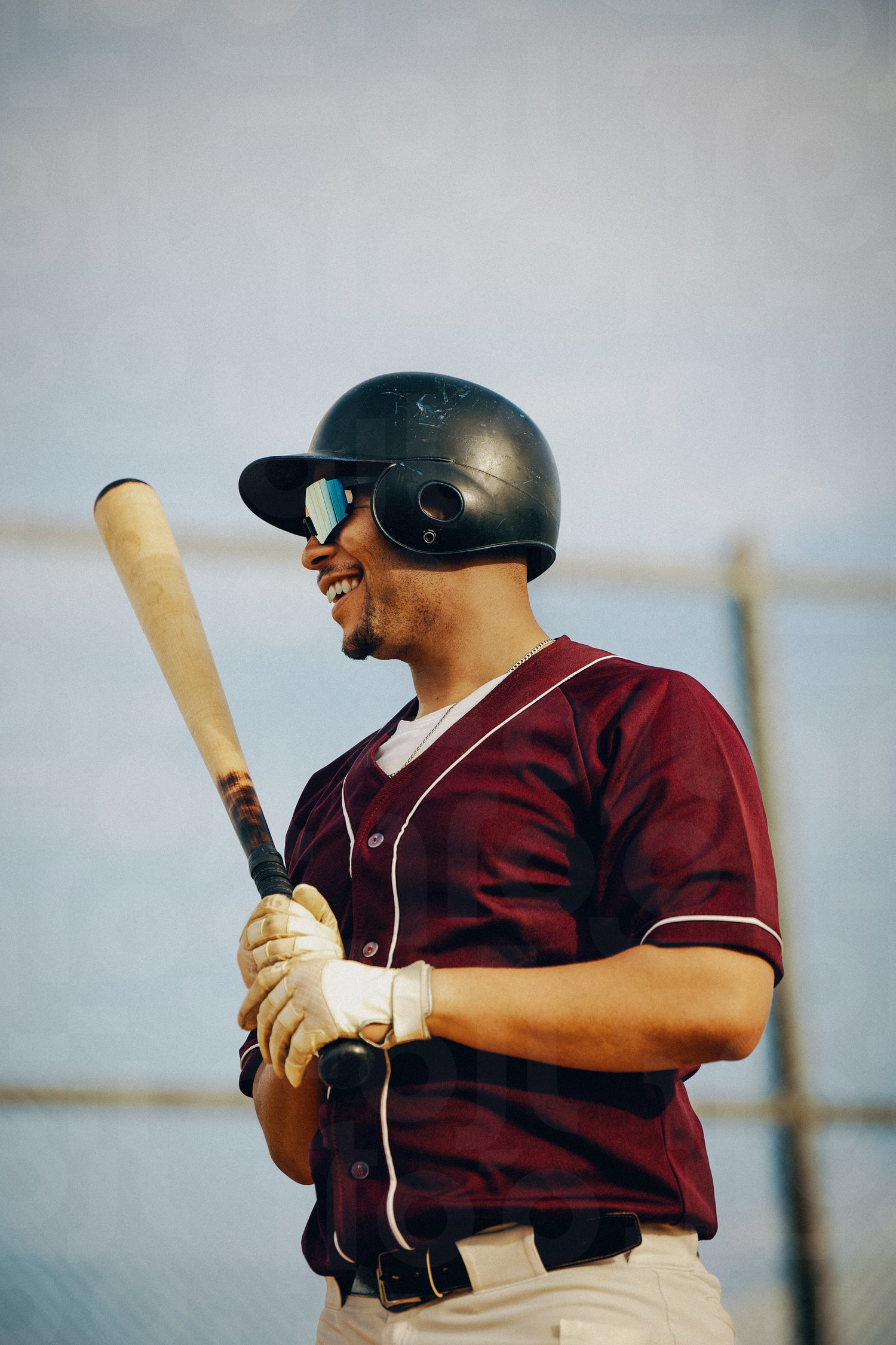 Cheerful amateur baseball player in burgundy jersey ready to bat in a local league game