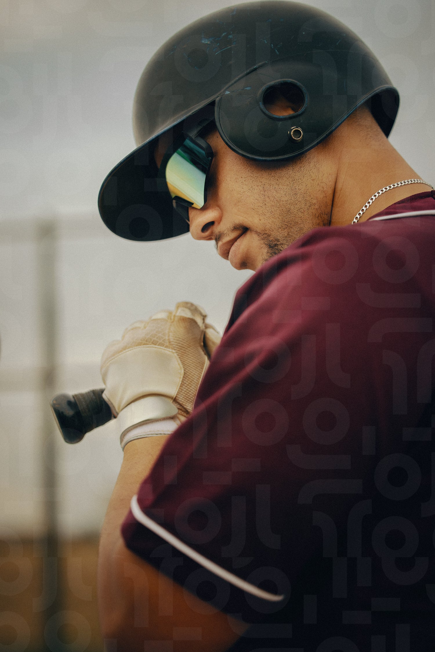 A close-up of a male baseball batter in sunglasses and helmet, highlighting his focus and readiness during a game. This photo has intentional use of 35mm film grain.