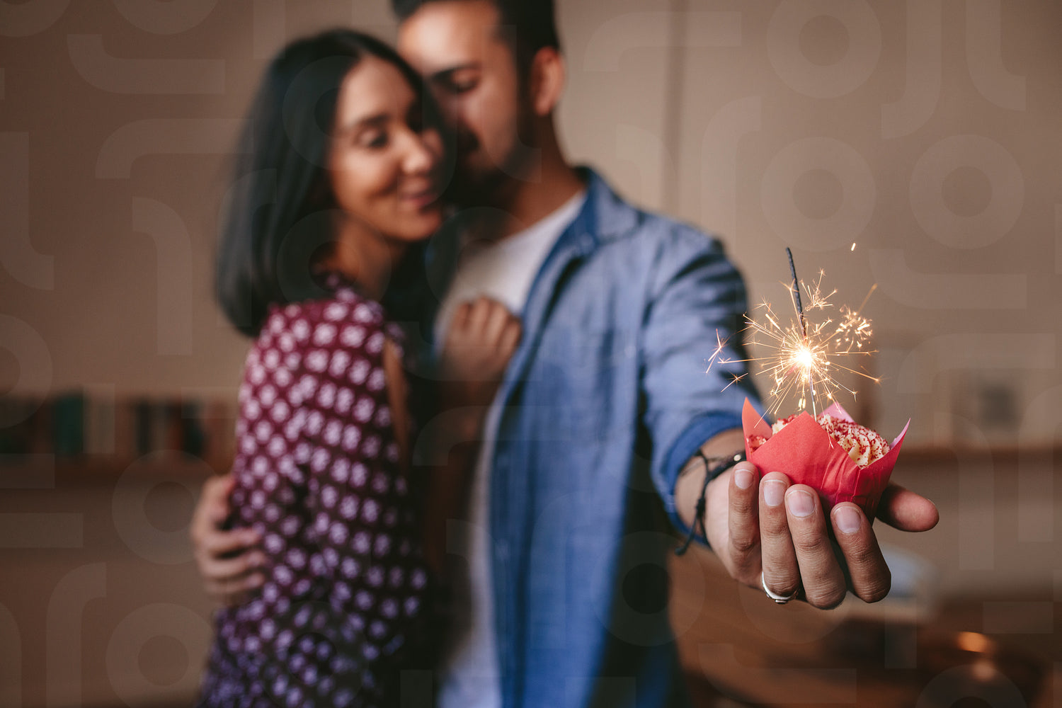 Romantic young couple celebrating their anniversary with cup cake. Young man and woman embracing with cup cake.