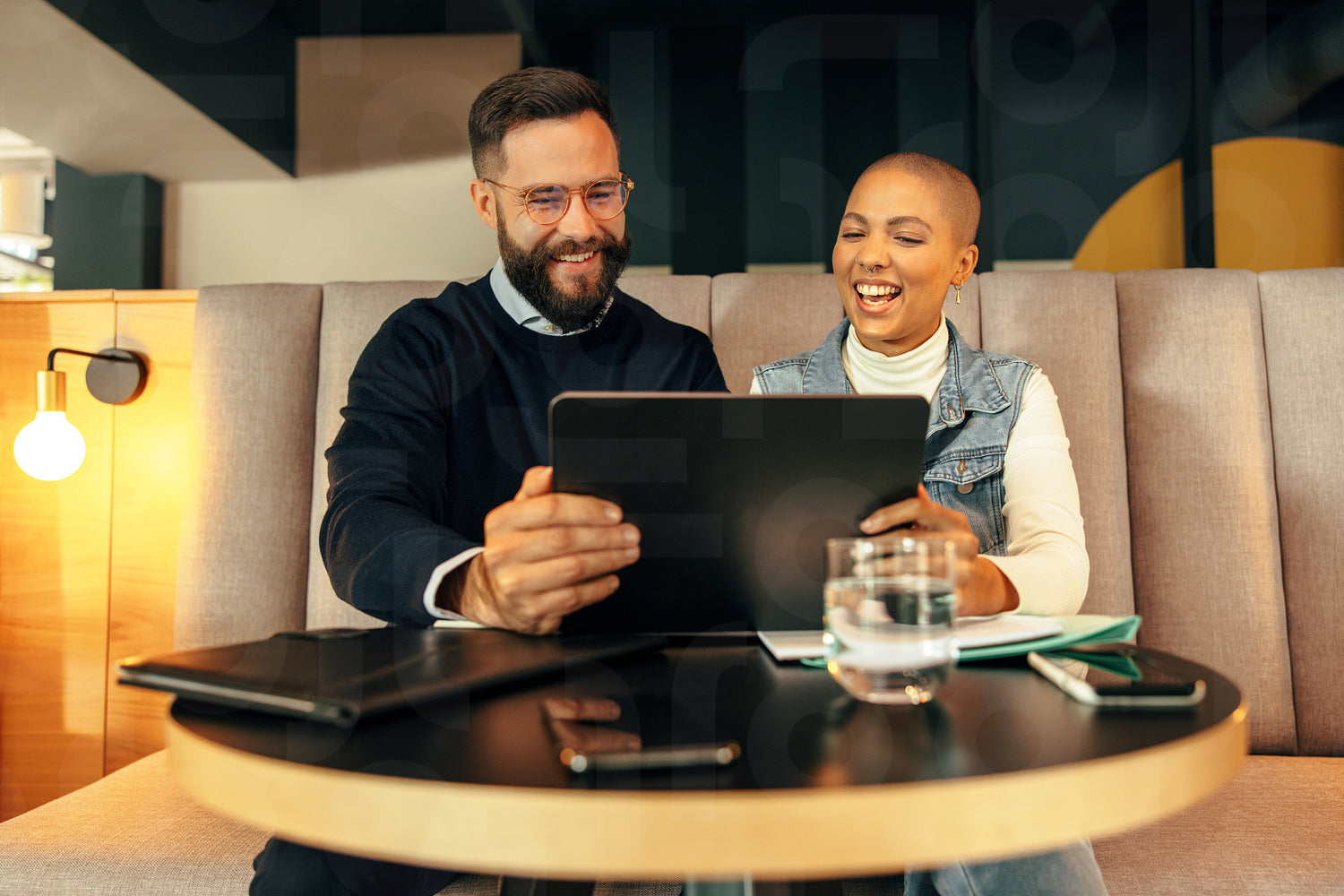 Two cheerful entrepreneurs taking a video call on a digital tablet. Two young businesspeople smiling happily during an online conference with their associates. Businesspeople working in an office lobby.