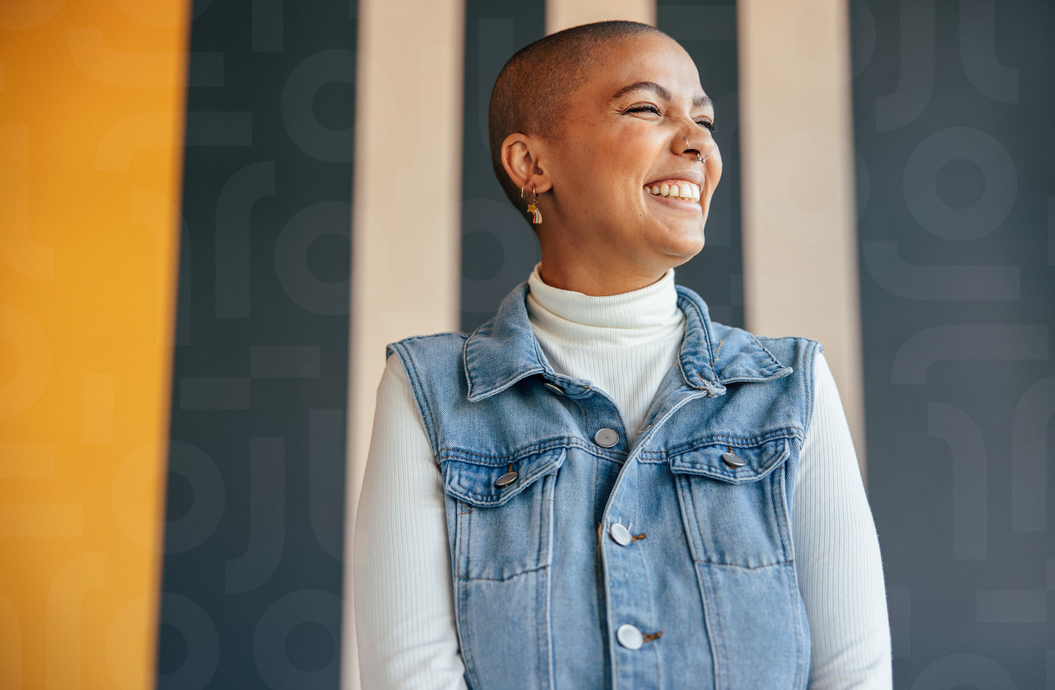 Excited businesswoman laughing happily while standing in an office. Happy millennial businesswoman contemplating exciting business ideas while standing against an office wall.
