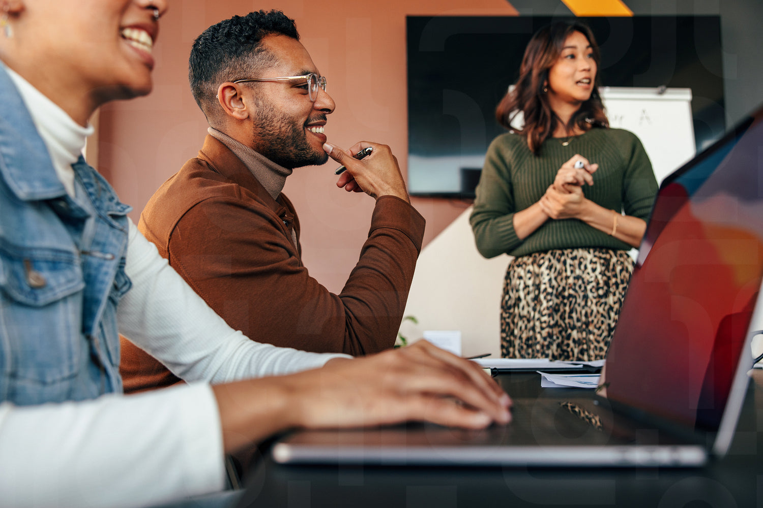Group of diverse businesspeople having a meeting in a boardroom. Young businesspeople smiling happily during a discussion. Multiethnic businesspeople working together as a team.