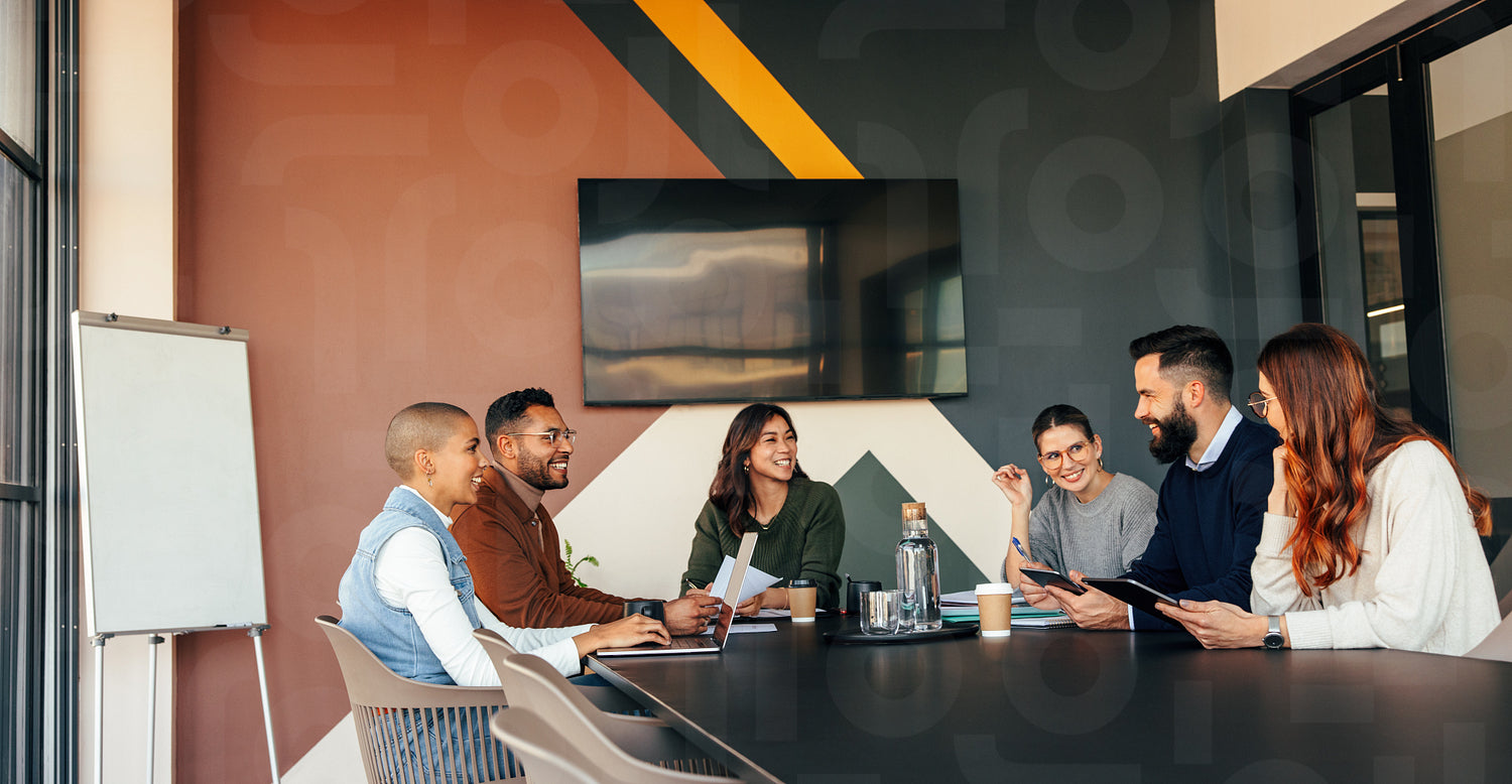 Happy businesspeople having a meeting in a boardroom. Group of multiethnic businesspeople smiling cheerfully during their morning briefing. Young entrepreneurs collaborating in a modern office.