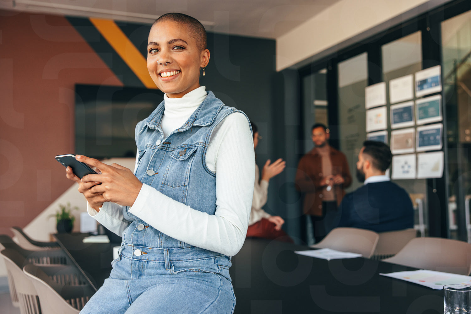 Millennial businesswoman smiling at the camera while holding a smartphone. Cheerful young businesswoman sitting on a boardroom table with her colleagues in the background.