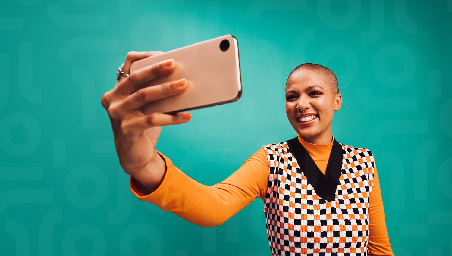 Smiling for the camera. Happy young woman posing for a self portrait on her smartphone camera. Young woman with short hair standing alone against a turquoise background.