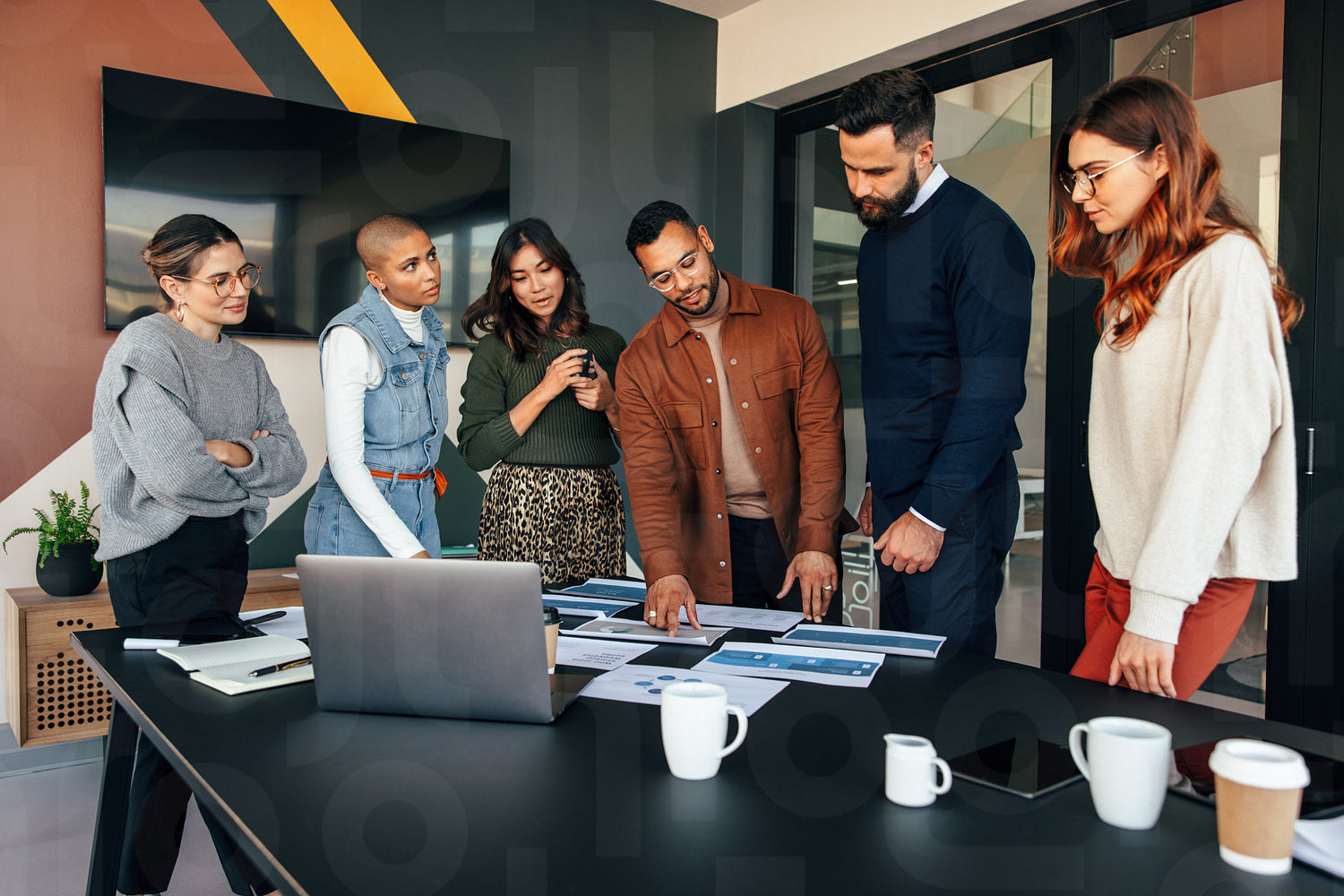 Team of businesspeople discussing some documents in a boardroom. Group of multicultural businesspeople standing around a table in a modern office. Diverse entrepreneurs collaborating on a new project.