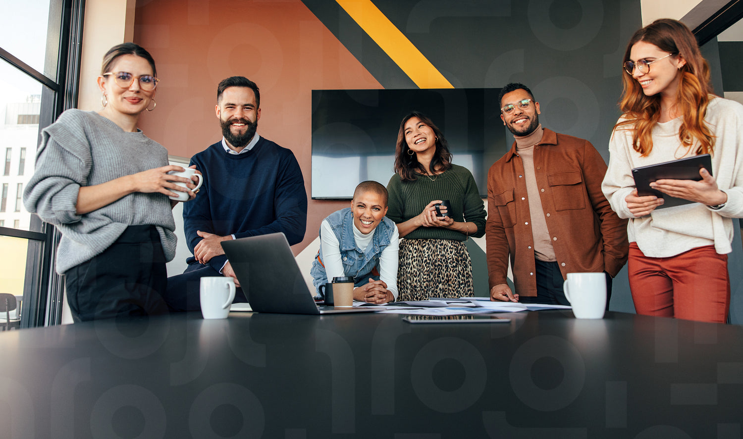Young businesspeople smiling happily in a boardroom. Group of multicultural businesspeople standing around a table in a modern office. Successful young entrepreneurs working together as a team.