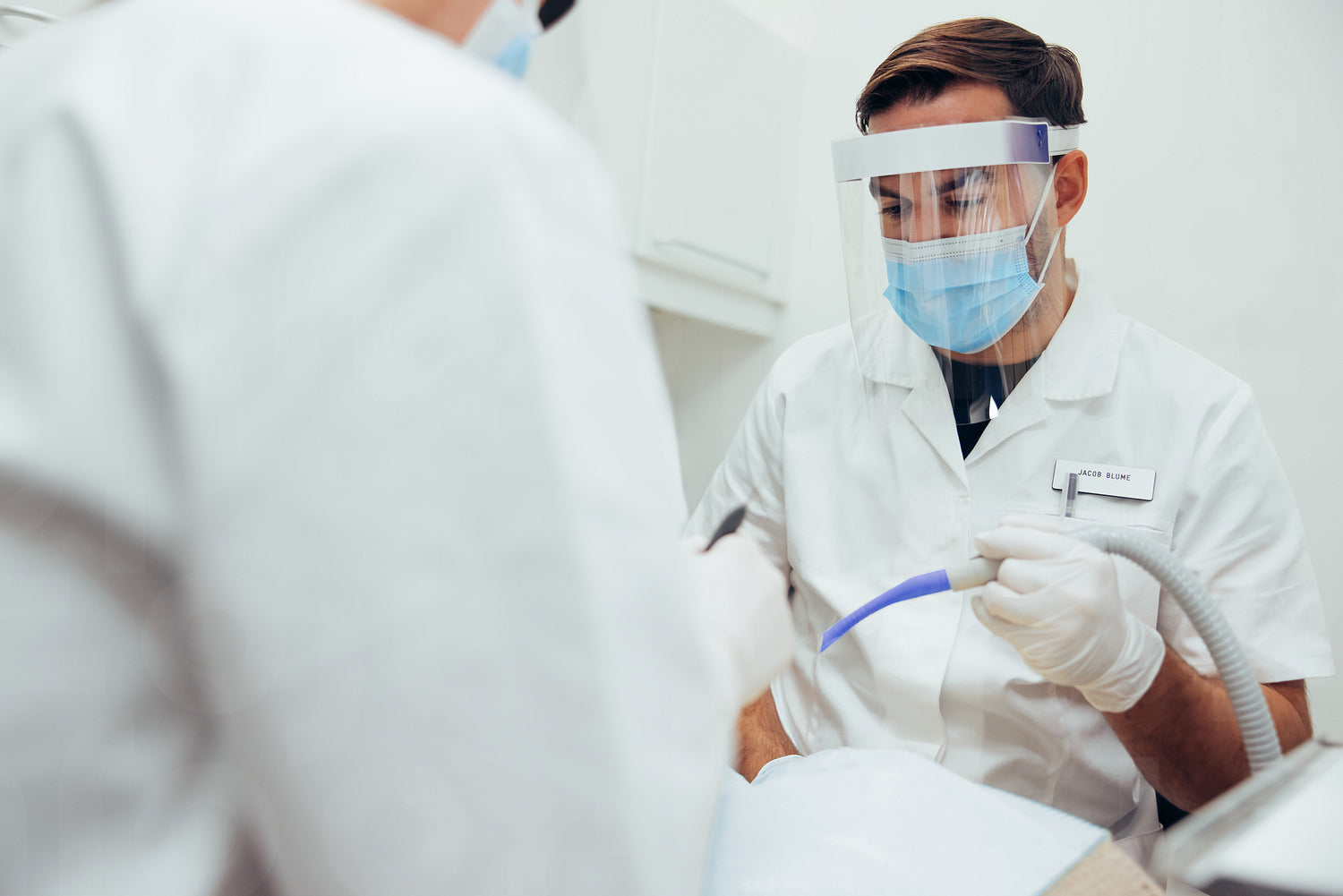 Male doctor working on patient's teeth with assistant in front. Dental doctor treating patient in his clinic.