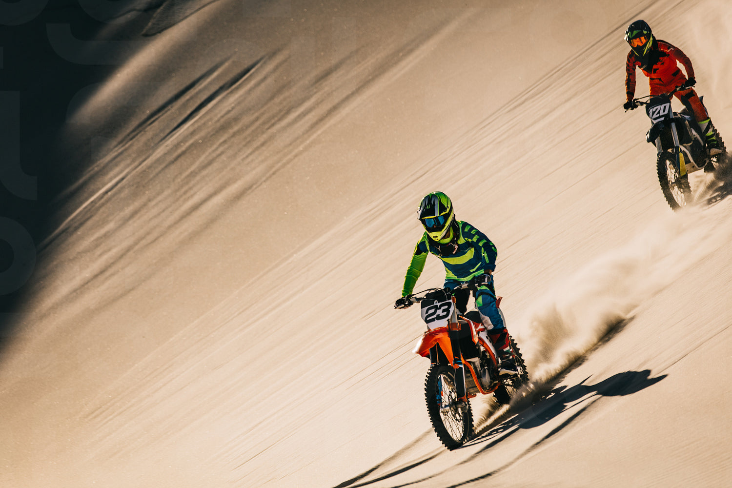 Dirt bikers in action driving the motorbike in desert. Motocross bike rider over sand dunes.
