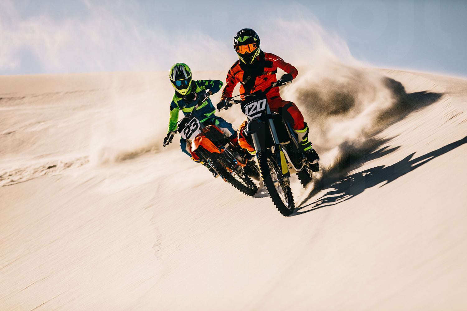 Two dirt bikers riding on sand dunes. Intense motocross race in action.