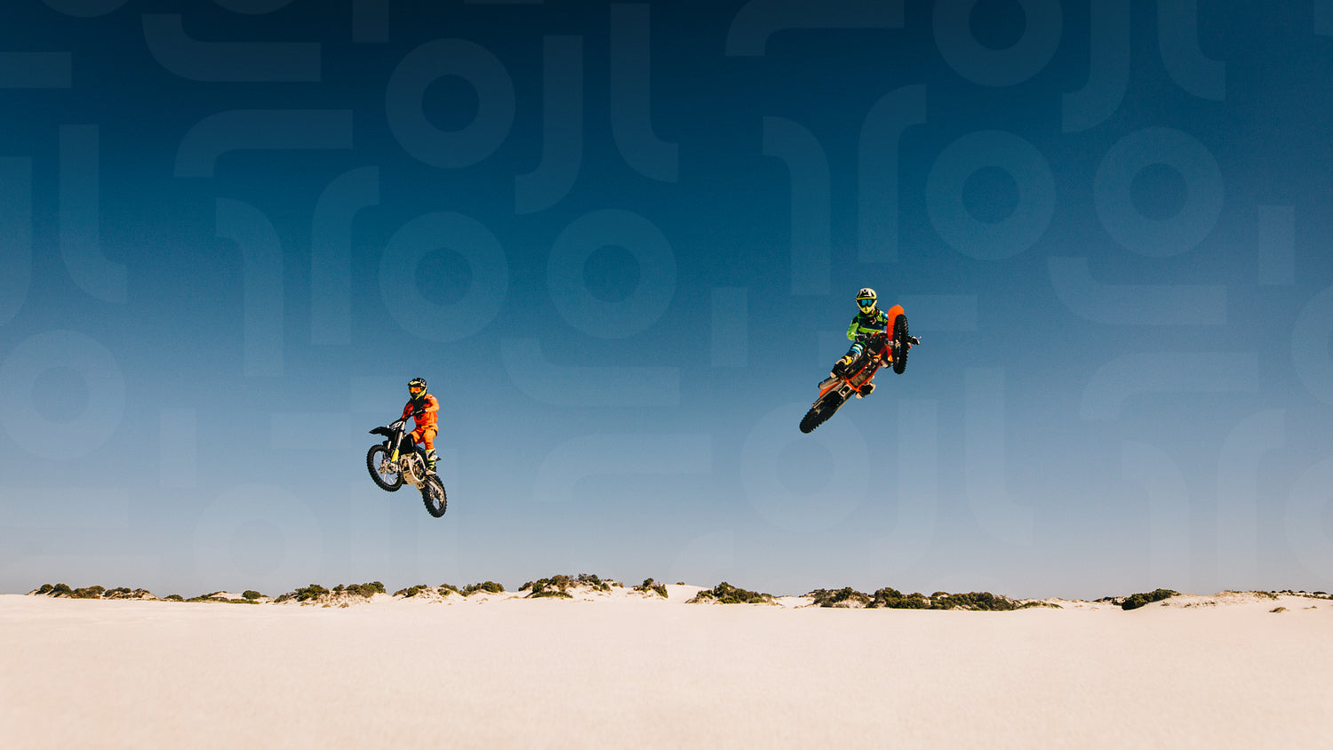 Motocross racers jumping bikes and doing stunts in desert. Dirt biker in mid air performing stunts.
