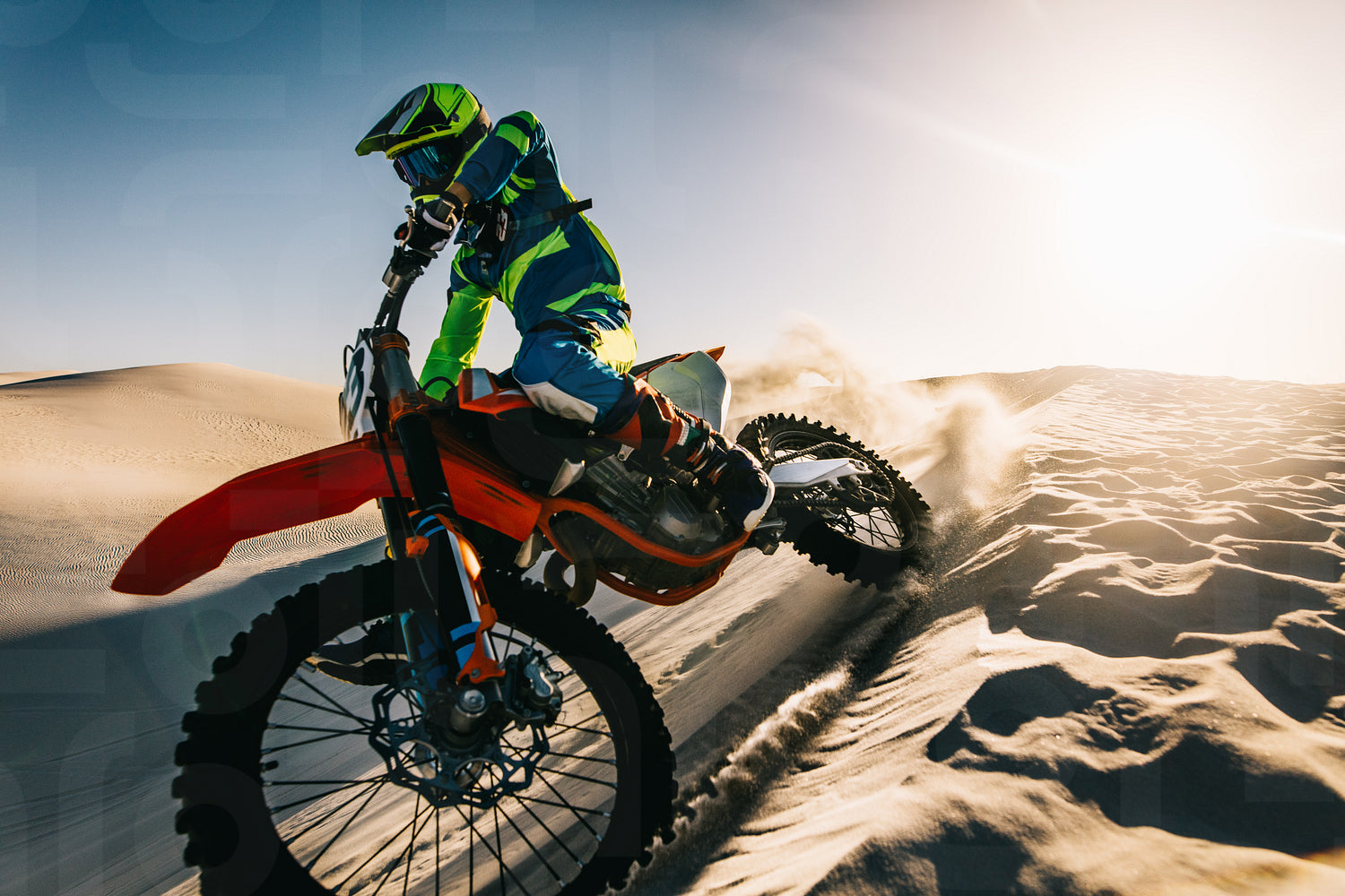 Man driving dirt bike over sand dunes in desert. Dirt biker turning and going down from sand dune.