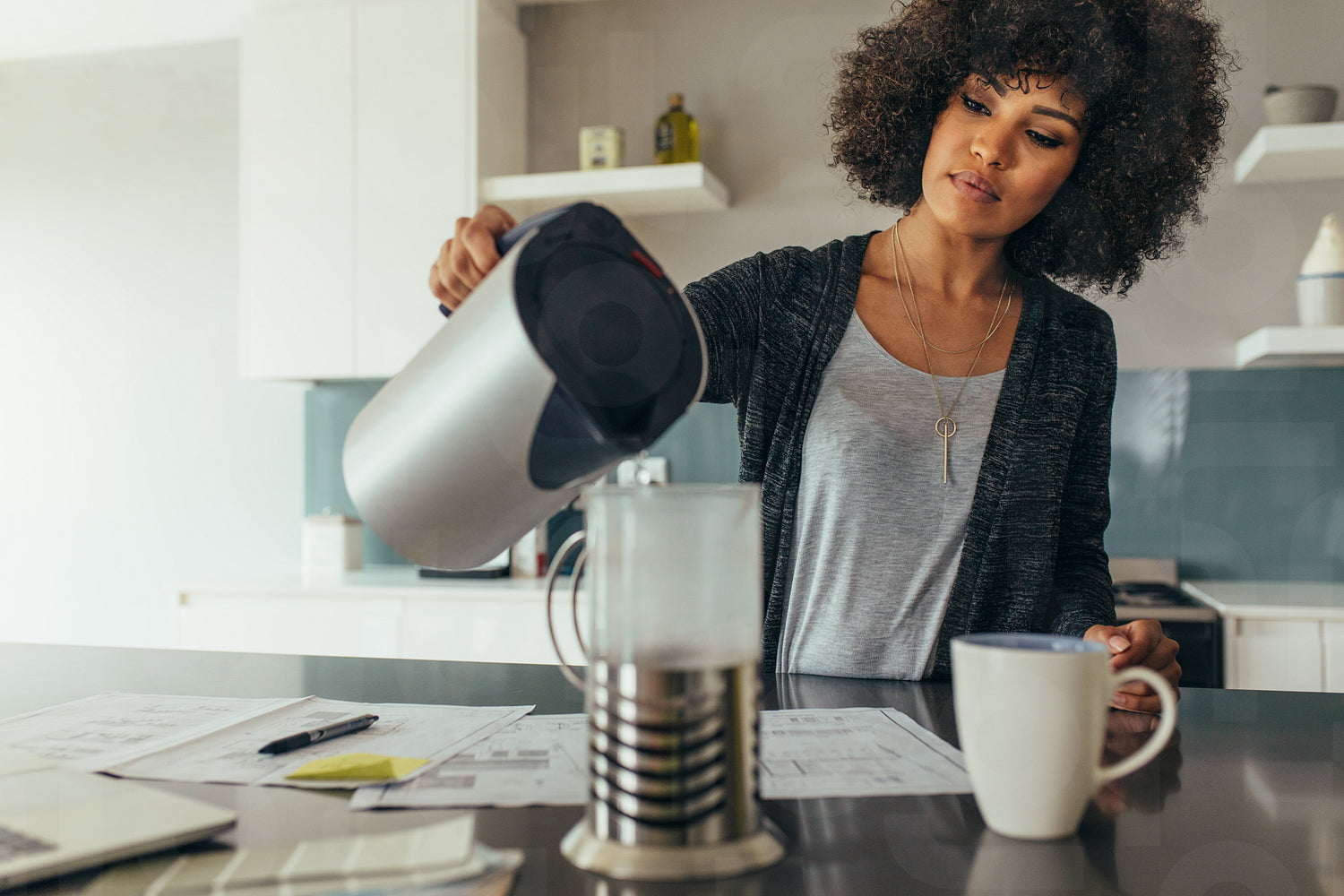 Young woman sitting at her working table pouring water in a jug. African female making coffee for her self while working at home office.