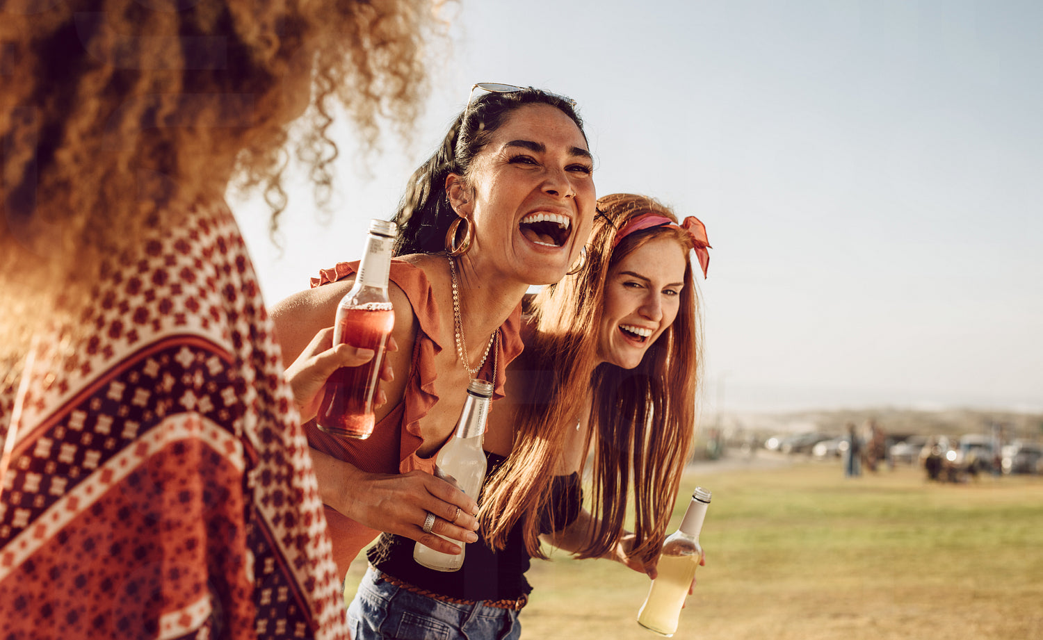 Three young women walking outdoors together and laughing. Group of multi-ethnic female friends having fun outdoors.