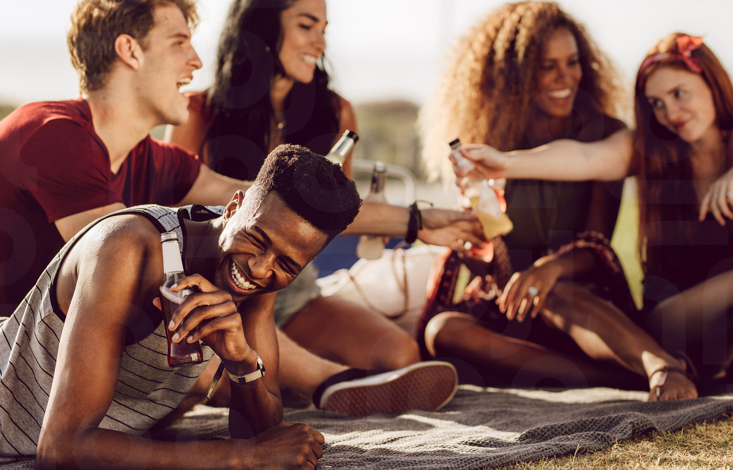 Cheerful young african guy sitting with friends outdoors and laughing. Man enjoying summer weekend with friends.