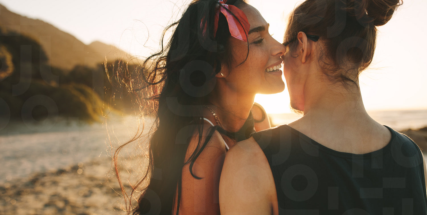Young woman whispering in man's ears on the beach. Romantic couple caught in a lovely moment at the beach.