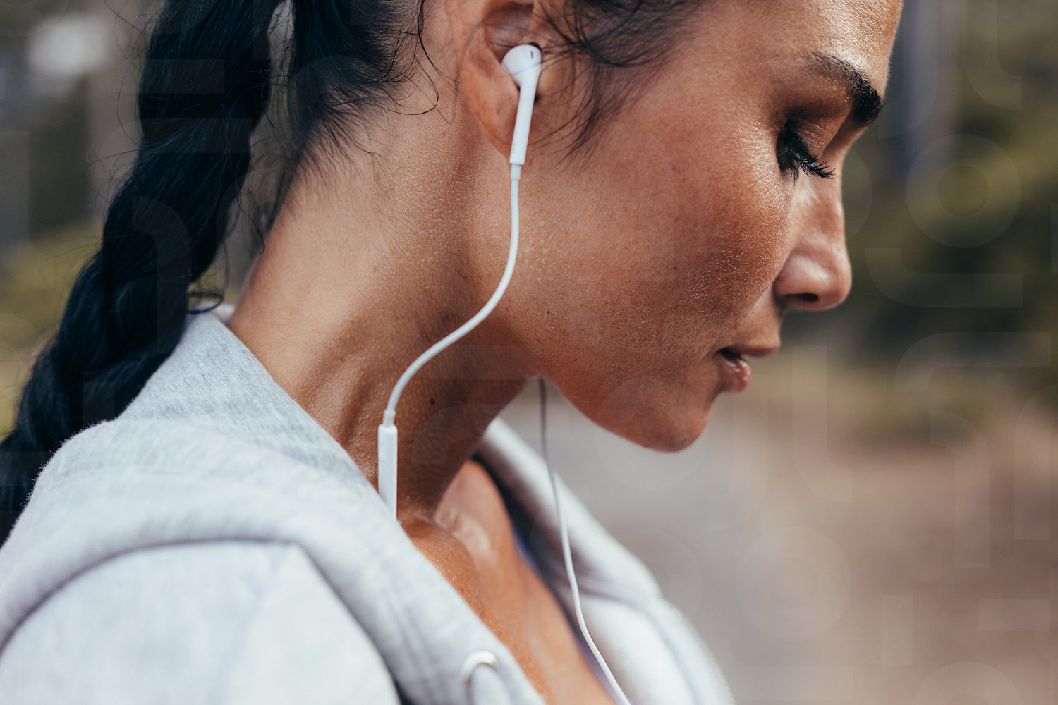 Close up of runner with sweat standing outdoors after her workout. Tired fitness female with earphones resting after exercising outdoors.