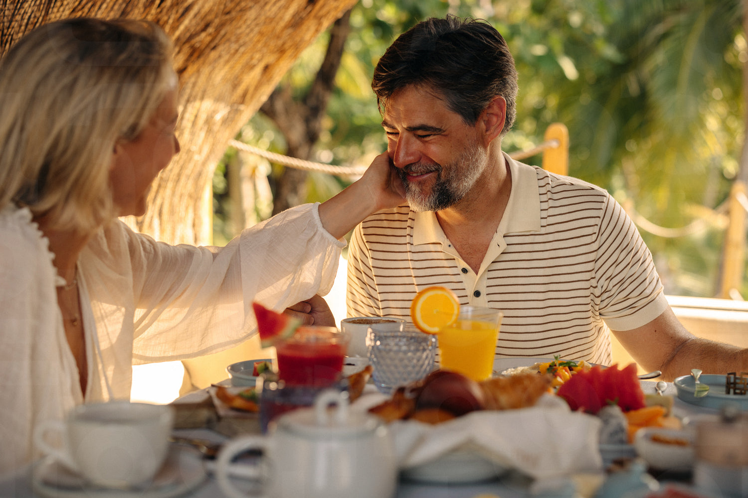 Happy couple enjoying a luxurious vacation breakfast at a tropical destination