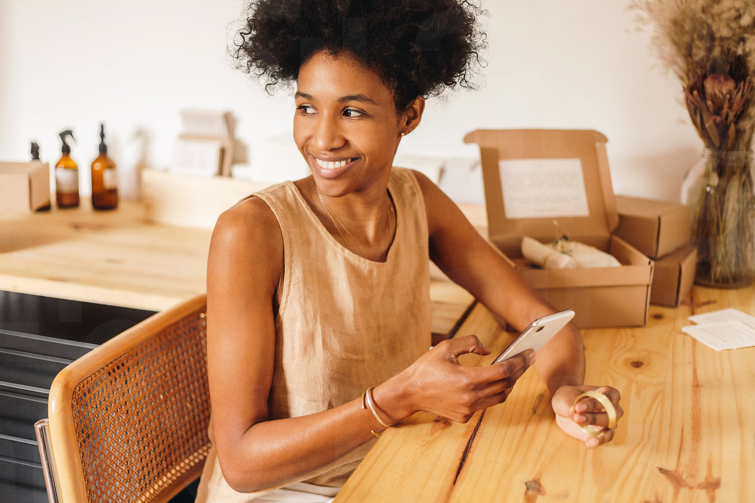 Jewelry designer glancing back and using phone for jewelry photo in studio. Happy ornament artist taking jewelry photo using phone for online selling ornament in workshop.