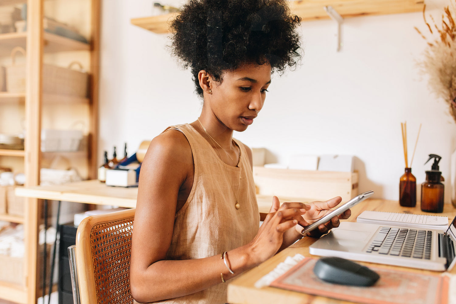Young jewelry business owner working on phone in workshop. Female artist using phone while working on laptop in jewelry designing studio.