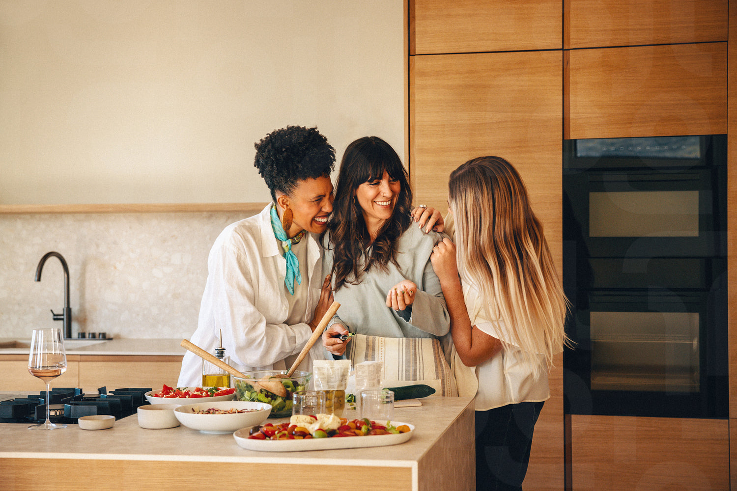 Three women enjoying their time while preparing a meal in a home kitchen together. Friendship, sisterhood and quality time with loved ones.