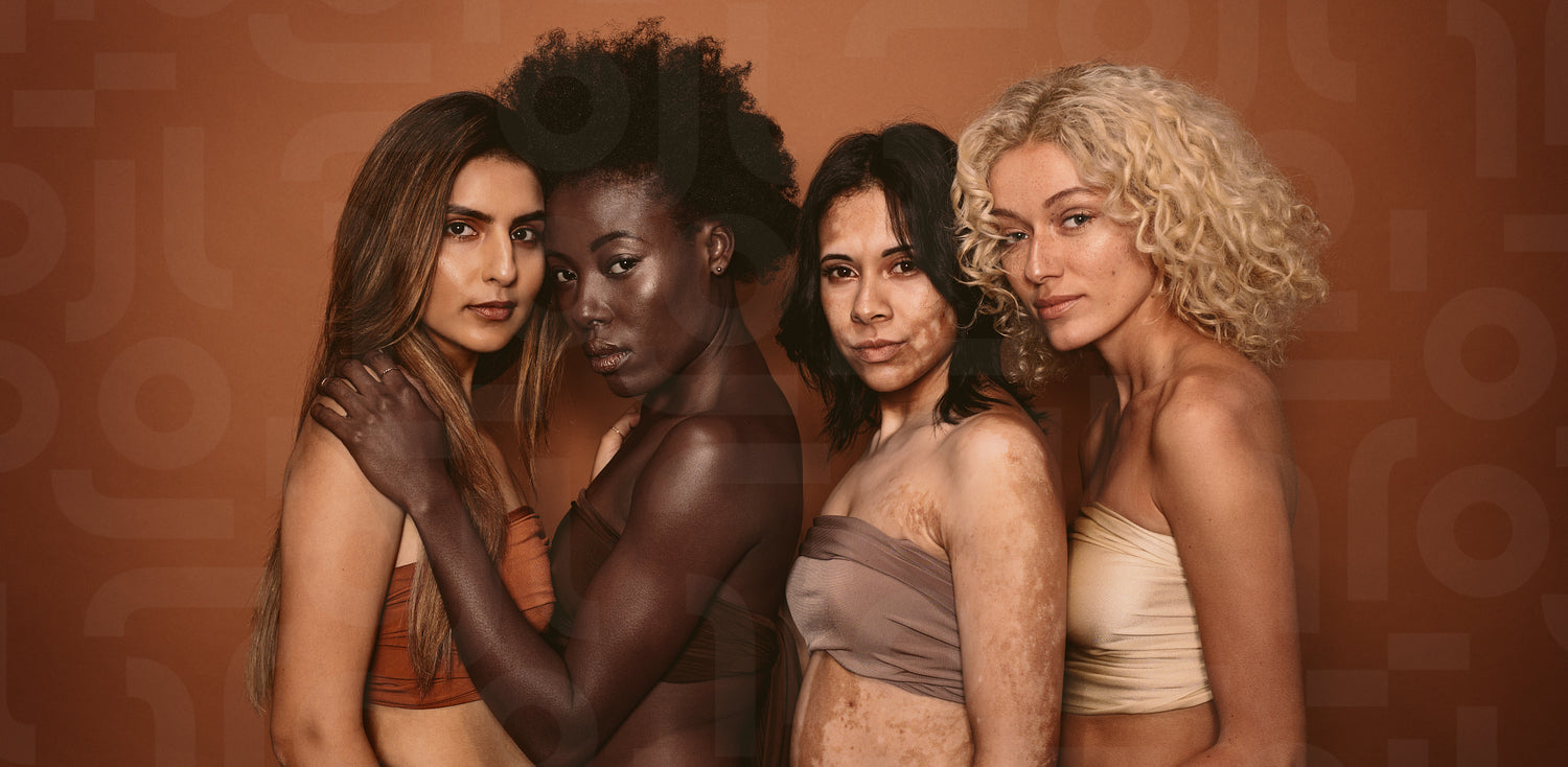 Group of diverse women standing together against brown background. Multi ethnic females looking at camera in studio.