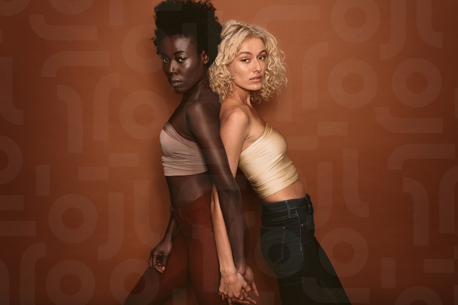 Portrait of two young women with diverse ethnicity standing back to back and looking at camera on brown background.