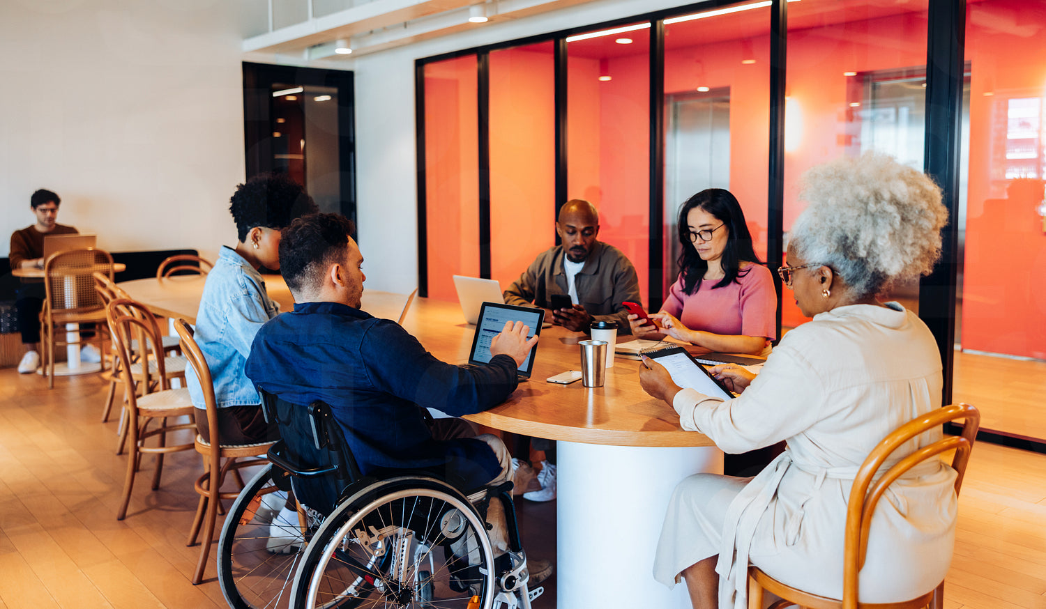 Group of diverse professionals gathers around a round table, using laptops, tablets, and phones for discussion and collaboration in an office setting.