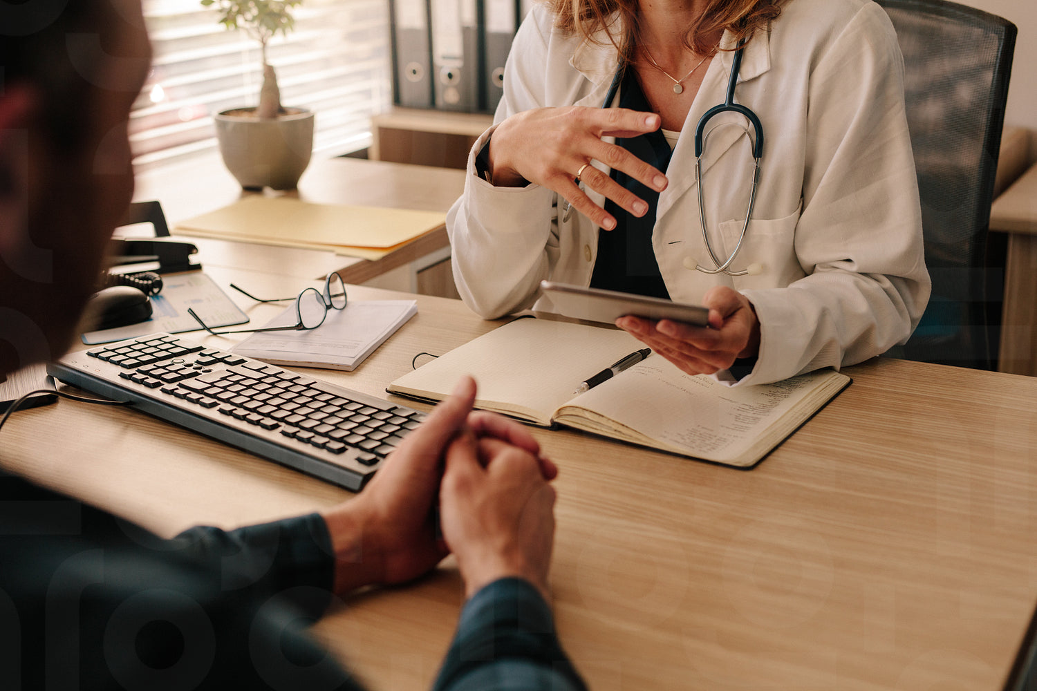 Female doctor talking about the treatment with male patient at her clinic desk. Cropped shot of female physician holding a digital tablet talking with patient in her office.
