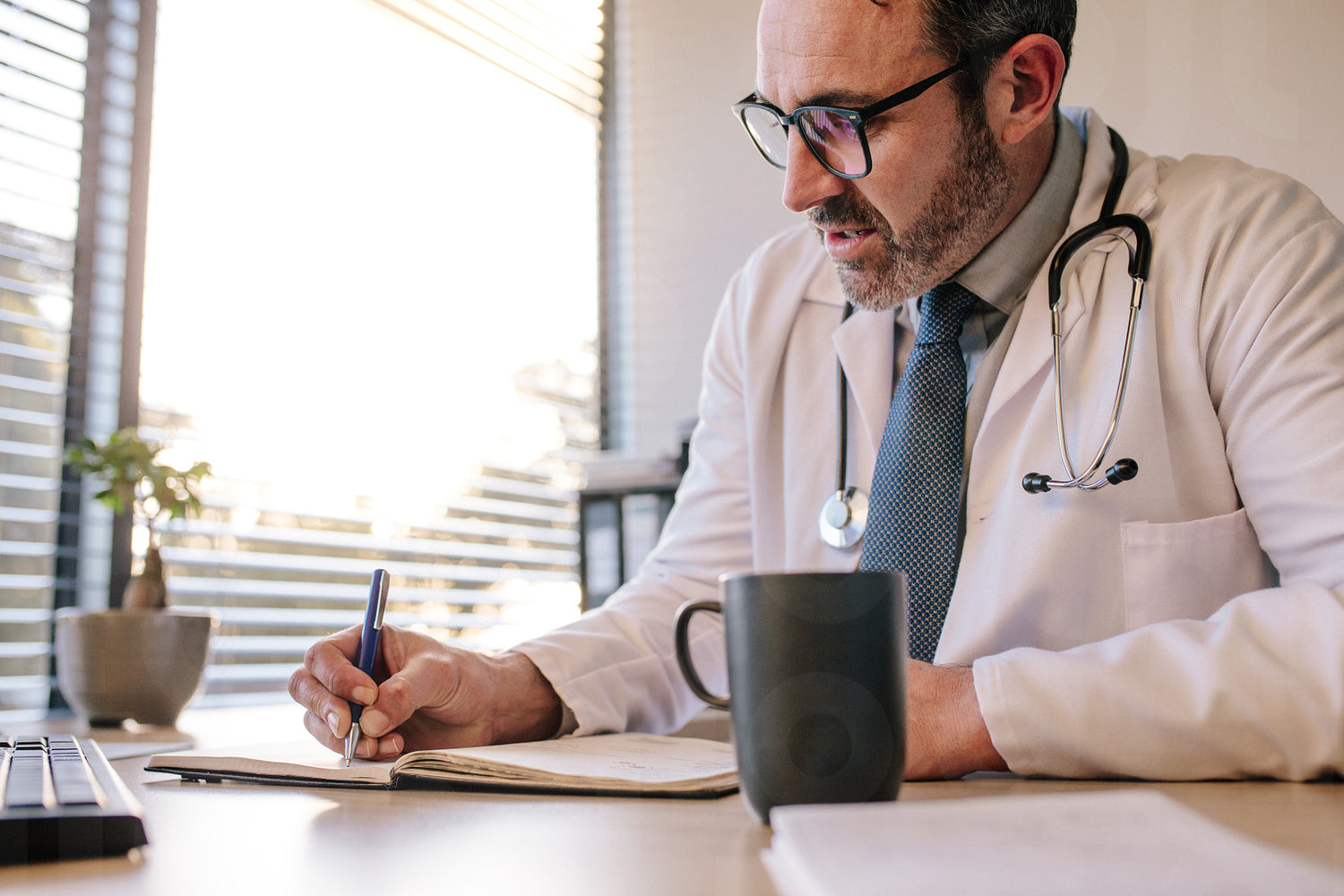 Doctor writing in his diary while sitting at his desk. Male mature doctor writing notes on patient in clinic.