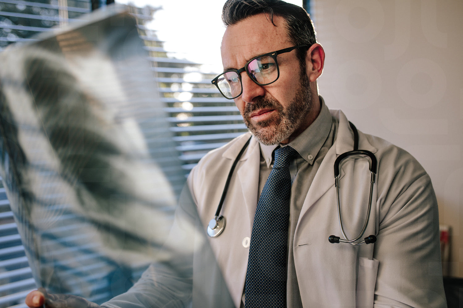 Concerned male doctor looking at chest x ray in his office. Doctor looking at scan, examining X-ray of patient lungs.