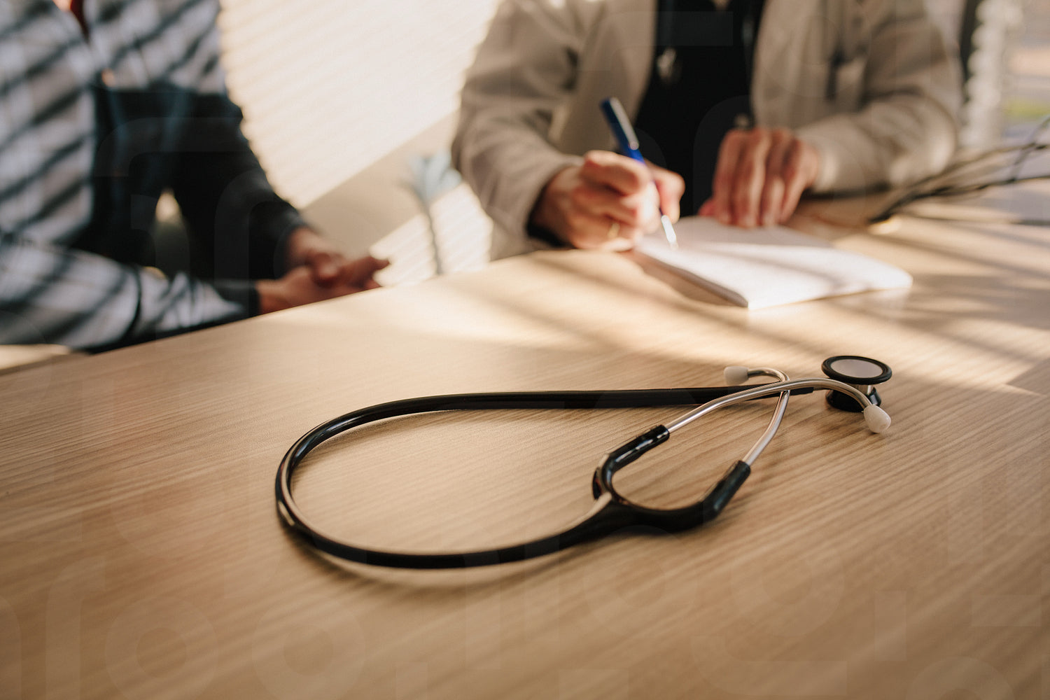 Stethoscope on table with female doctor prescribing drugs to her patient. Physician writing medicine prescription for the male patient.
