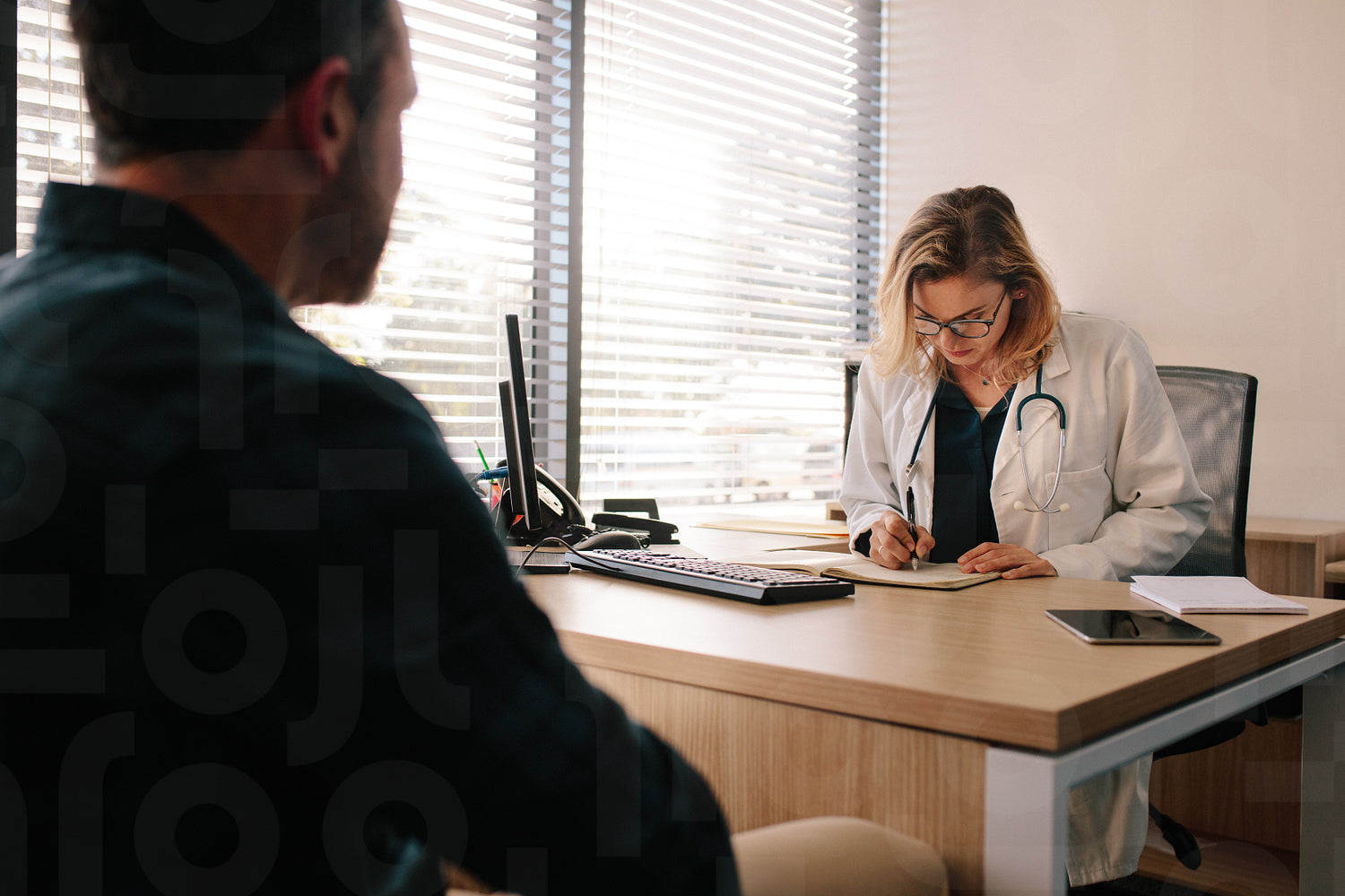 Female doctor making notes in her book while consulting a patient. Doctor writing medical history of male patient sitting across her desk in hospital.