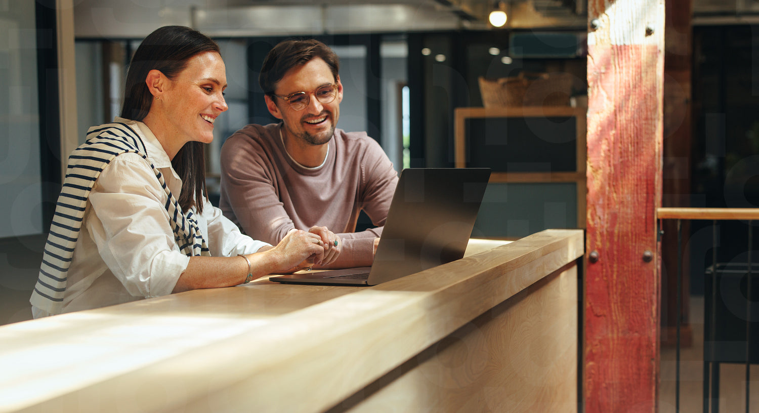 Business professionals joining an online conference on a laptop. Two business people connecting with their clients while sitting in a coworking office.