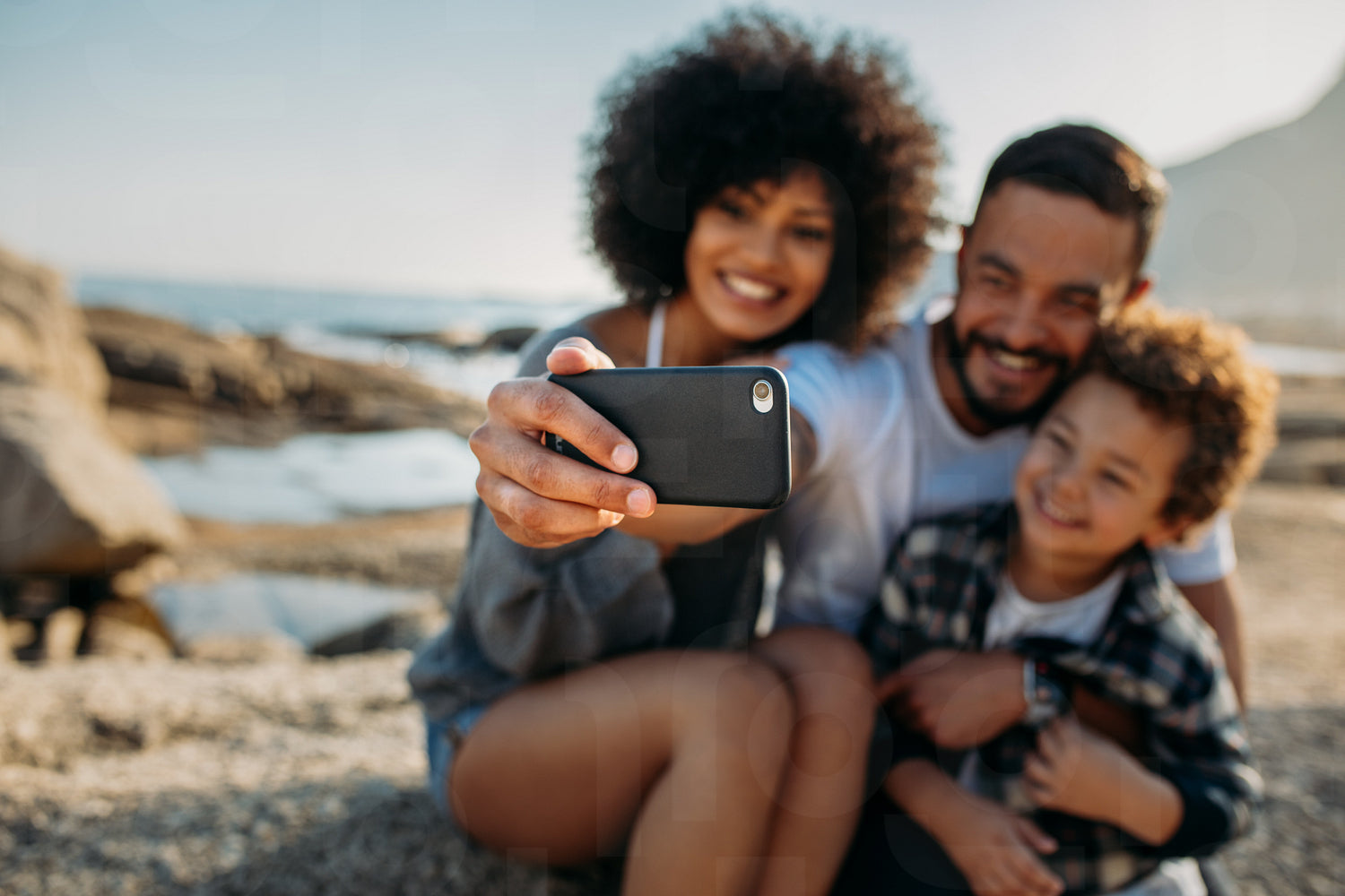Man using a mobile phone to shoot a selfie with his family. Blur shot of a couple with a kid sitting together taking selfie near seashore.