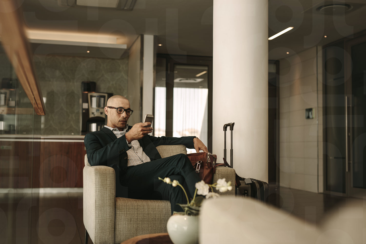 Business traveler waiting in airport lounge and using mobile phone. Businessman waiting for fight at airport lounge.