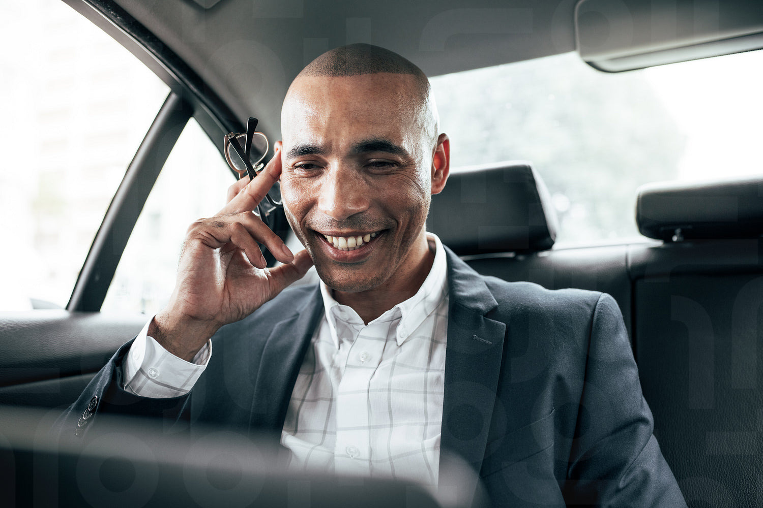 Businessman working on laptop computer while commuting to office in his sedan. Smiling man holding eyeglasses in hand managing business work on the move sitting in car.