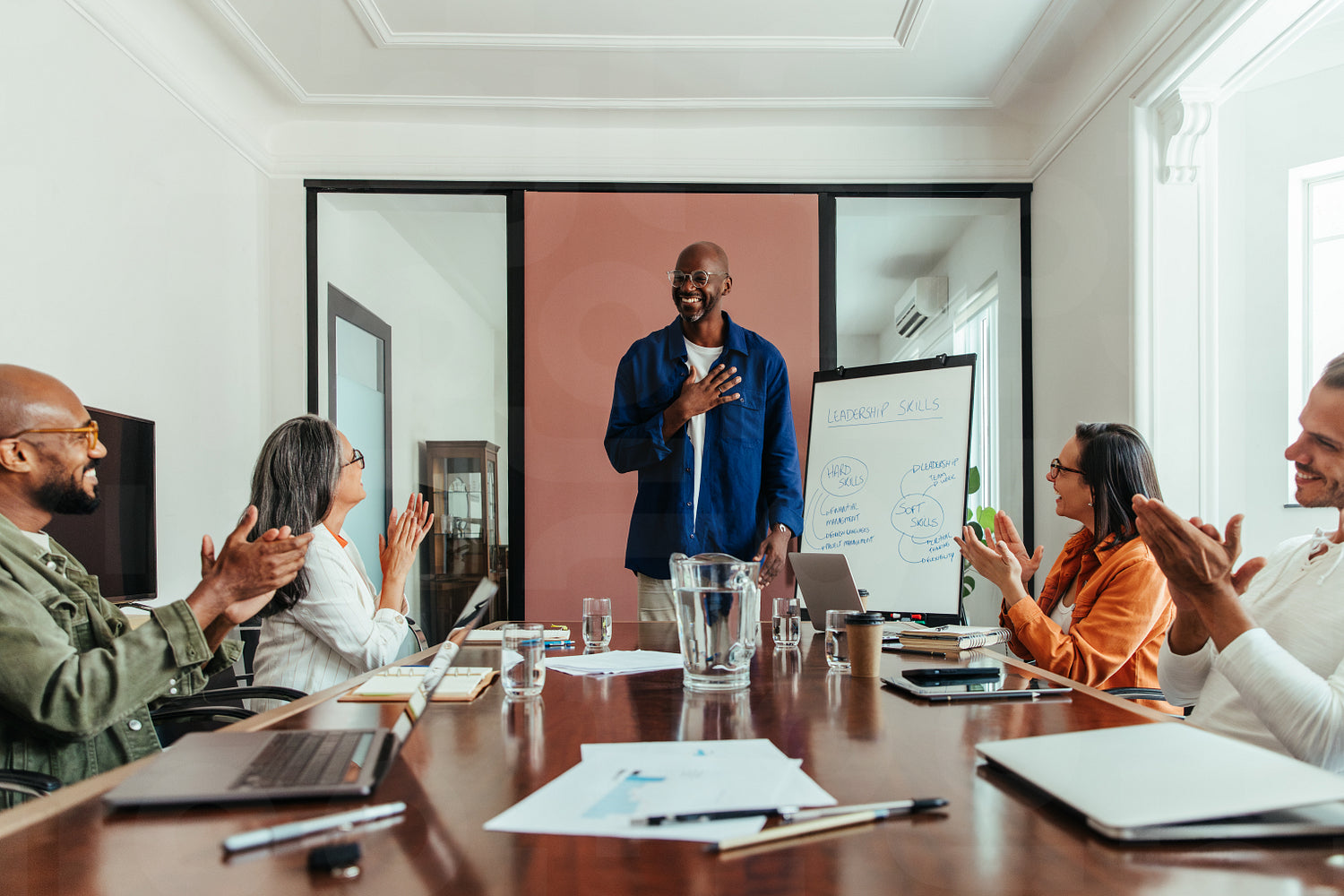Black man leading a diverse team in a creative meeting, showcasing leadership skills