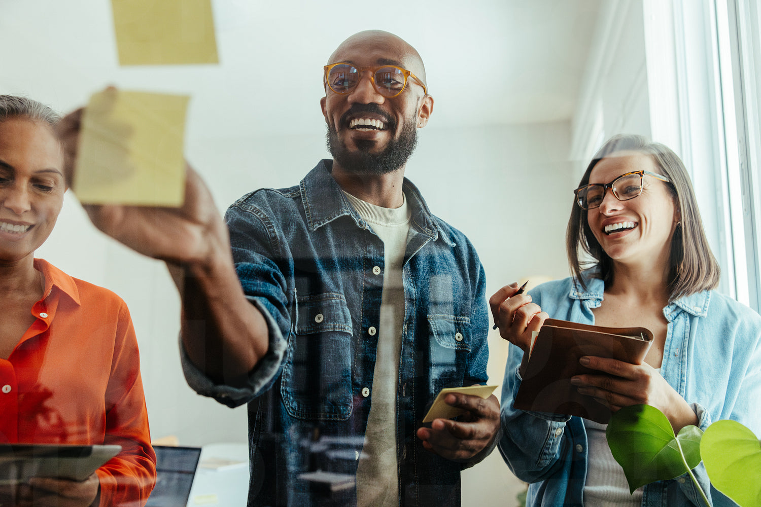 Diverse group of professionals in a business workshop brainstorming and sharing ideas while taking notes and collaborating.