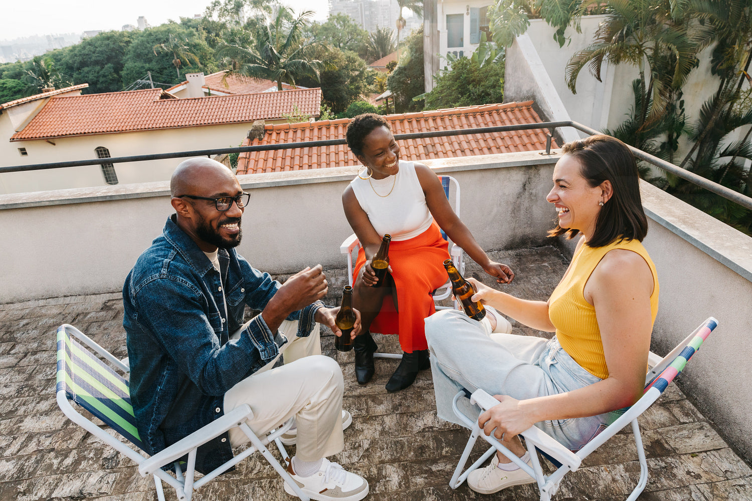 Group of diverse friends relaxing and sharing laughter with beers on a rooftop terrace, enjoying a casual and joyful time together.
