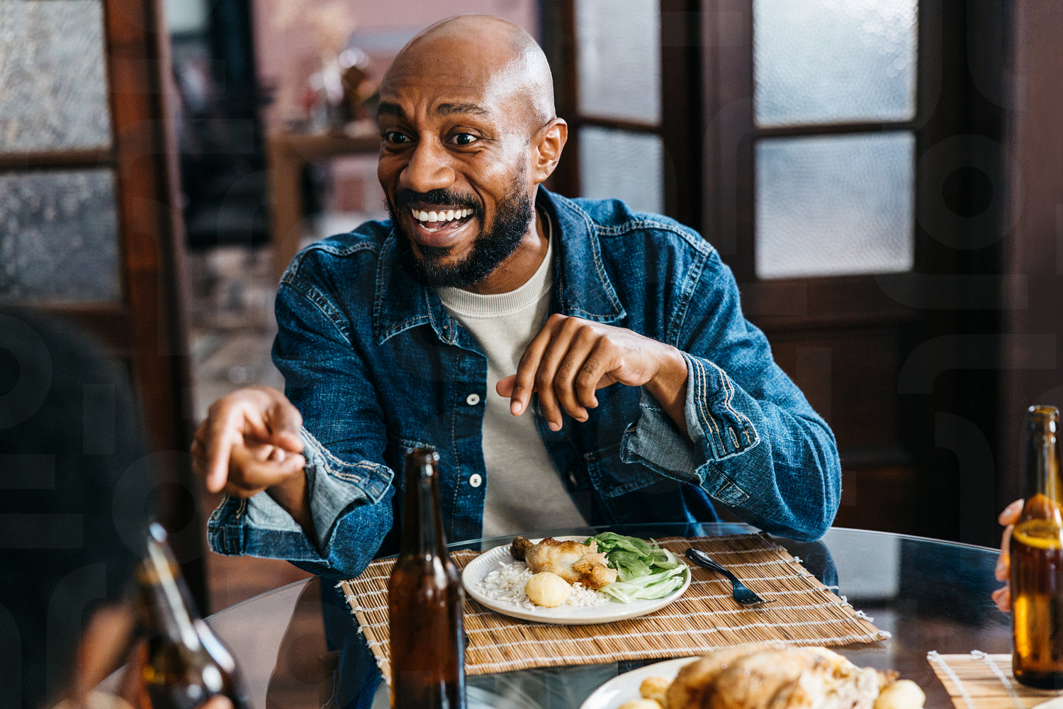 A cheerful black man sharing a joyful moment with friends while eating a homemade lunch and enjoying drinks. The setting is cozy and inviting.