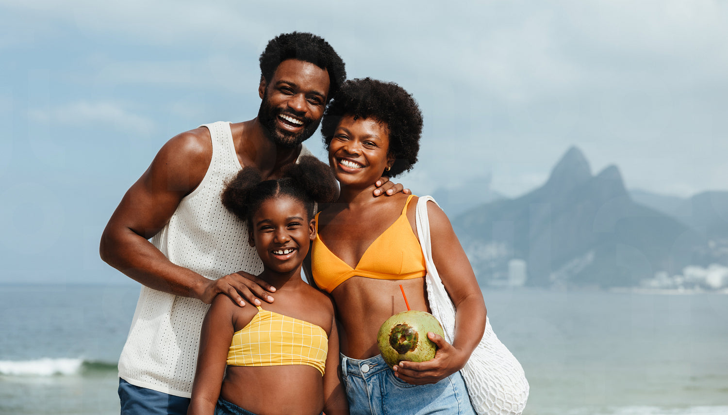 A joyful family enjoys their holiday on the famous Ipanema Beach. The image features a smiling family of three, including parents and child, embracing each other near the ocean.