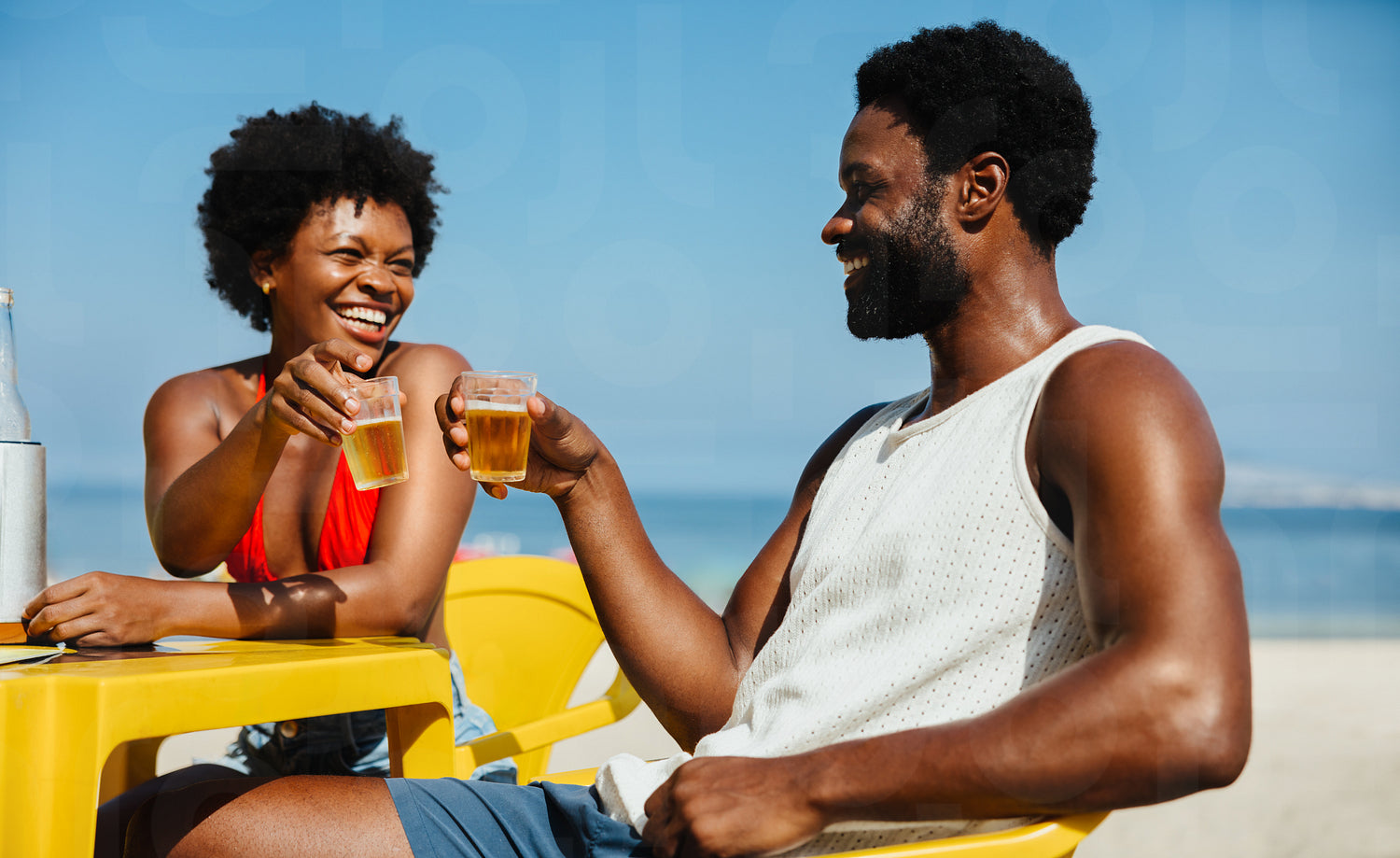 A joyful young African couple clinks glasses while enjoying a relaxing holiday on the beach. This image captures the essence of leisure, romance, and the carefree spirit of a seaside vacation.