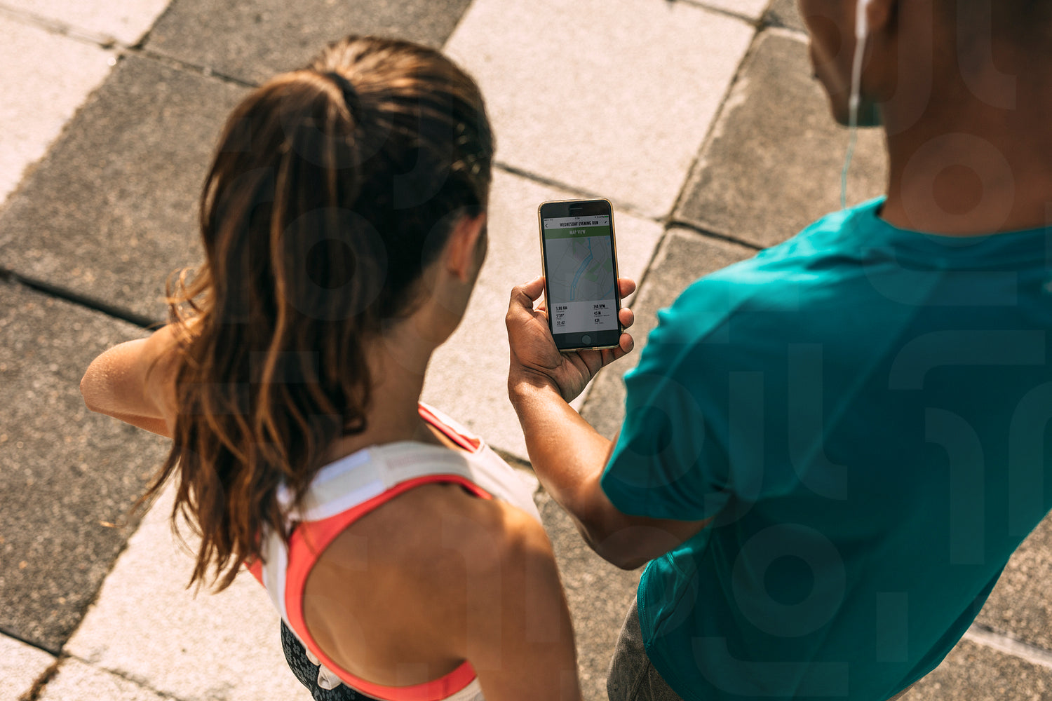 Male and female runner using a fitness app on mobile phone. Fitness people checking the summary of their run on smartphone.