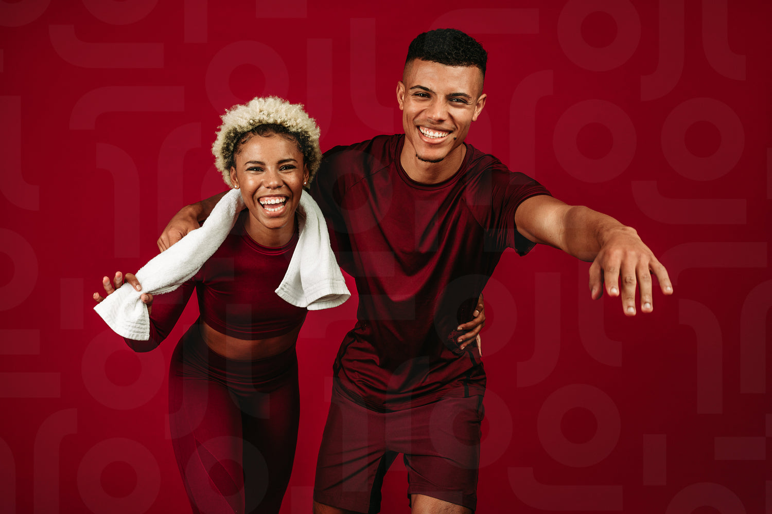 Cheerful african american fitness couple relaxing and having fun after workout. Happy couple holding each other and bending forward against maroon background.