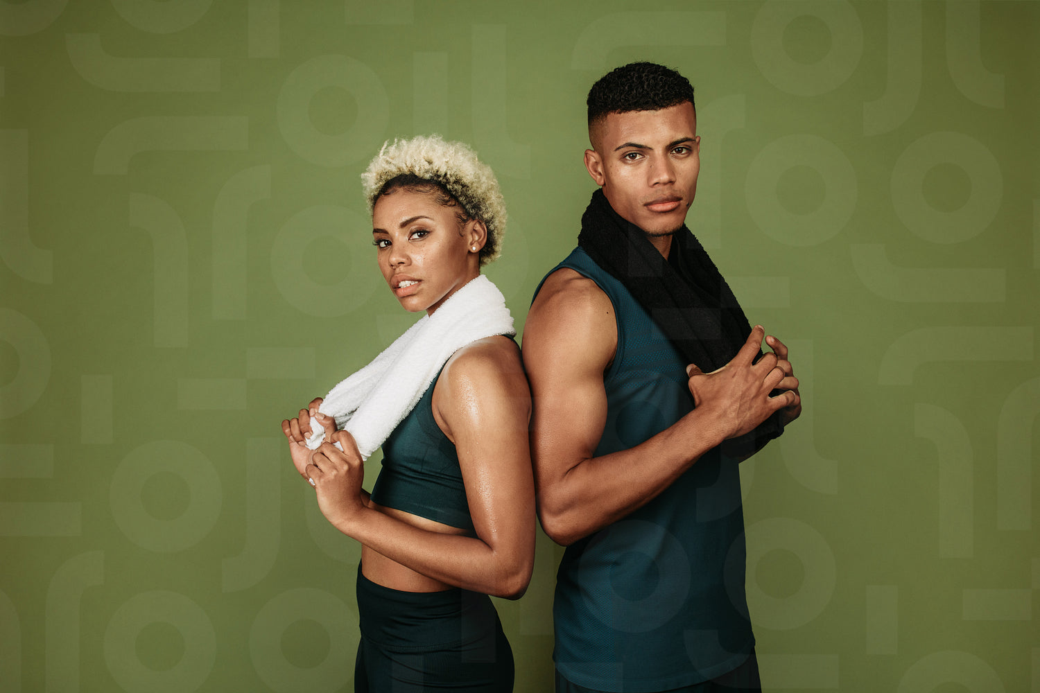 African american man and woman in fitness wear standing together after workout. Fitness couple relaxing after work out holding towels.