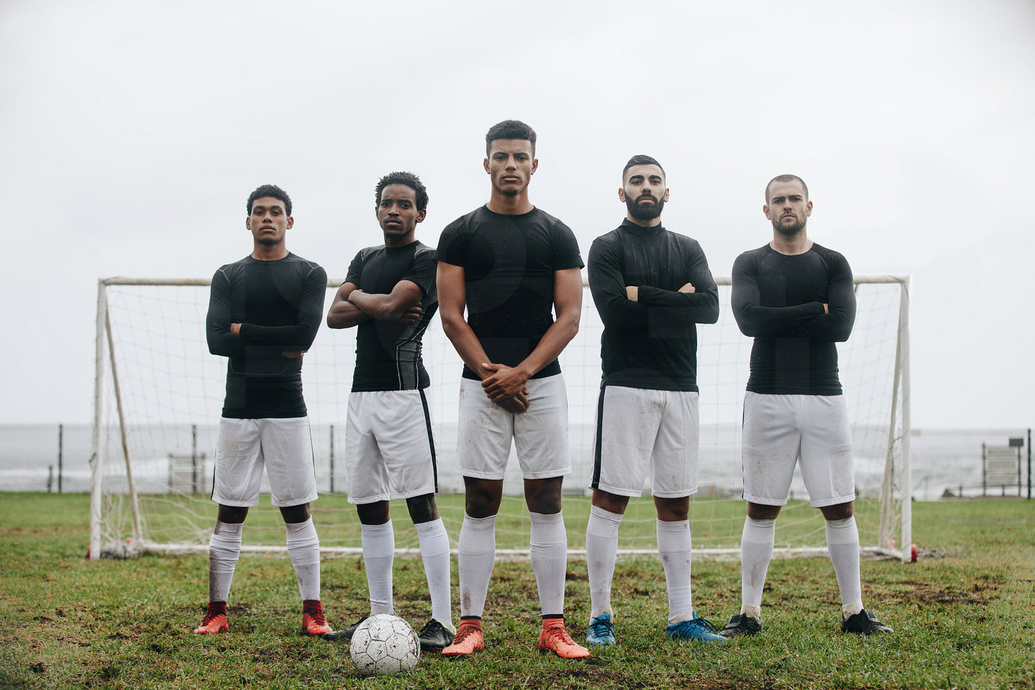 Soccer players standing side by side in front of the goalpost with crossed arms. Group of soccer players standing together on field with a football in front.