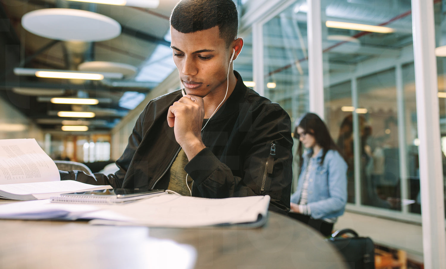 Man wearing earphones looking at digital tablet while sitting at university library. Male student studying at college campus using digital tablet.